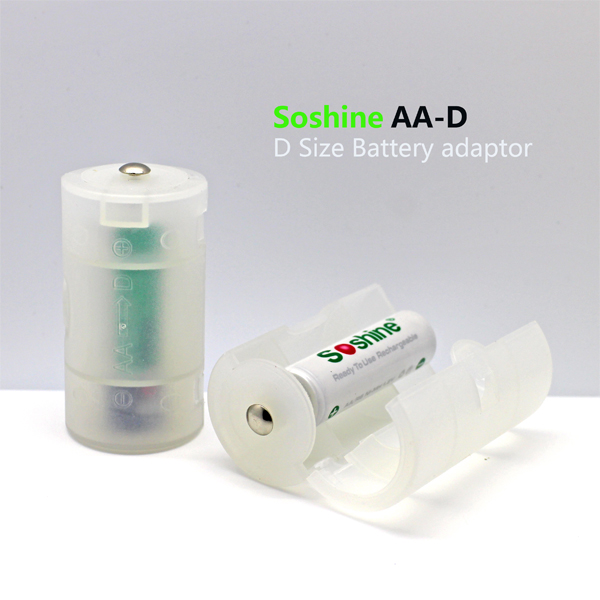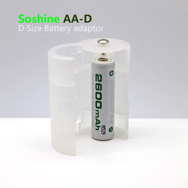 Soshine 1 pcs AA to Size D Battery Adapter Converter Case Bar Code:6951151532053 Model:AA-D (SBC-005) Features: This AA to D size battery converter is convenient,reduce weight and save money for you.. Perfect for electronics and emergency situations. Specification: Weight: 9.3g Dimensions: H60.3xD31.8mm Material:PP(Polypropylene) Colour: white D size battery adapter for 1pc AA Rechargeable Battery Packing:.