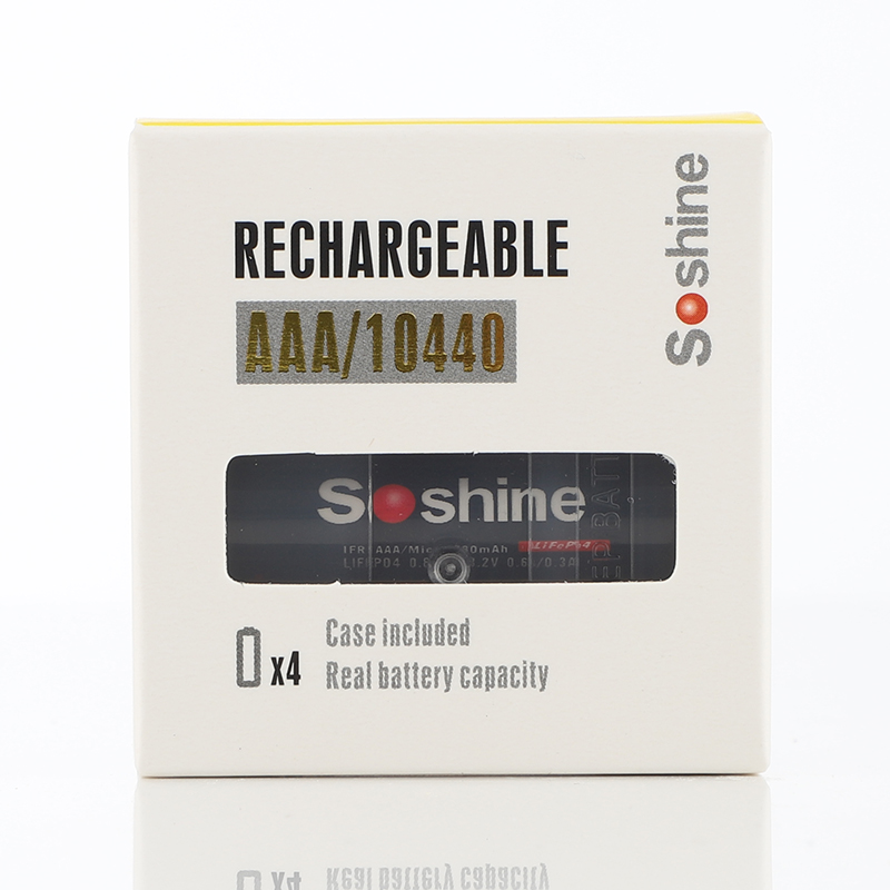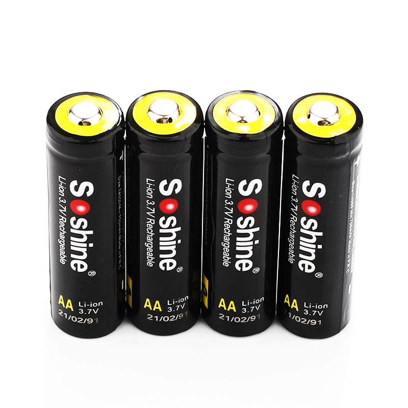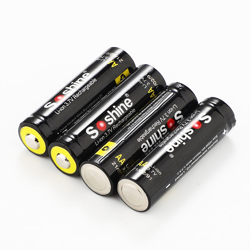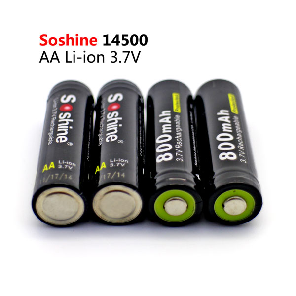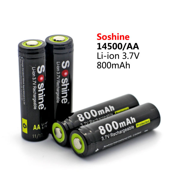 Soshine Battery 3.7v 800mAh 4× Li-ion 14500/AA With Protected Model:14500P-3.7-800 Bar code:6951151512192 Features: AA Li-Ion rechargeable battery 3.7V 14500 size Cylindrical Li-ion Cell, same size as AA 1.2V rechargeable NiMH and NiCd battery. No memory effect and longer storage life than NiMH Batteries. Lighter weight and higher energy density than any other rechargeable batteries. 14500 cell has same size as an AA size battery, but has 3 times higher voltage. It is perfect for building battery pack for RC aircraft, RC cars, and RC robots. Can use special PCB ( protection IC) to build 14500 battery pack. Protected board against short circuit, over discharge, over-current discharge. Specification: 14500/AA Capacity: 800mAh Rechargeable for 1000 times Peak Voltage: 4.2V Nominal/Working Voltage: 3.7V Maximum charge current: 1.5C Maximum discharge current: 2C Internal resistance: 104-110 mΩ Temperature: -40℃~60℃ Dimension: 14x52mm Protected board against short circuit, over discharge, over-current discharge. Maximum voltage protection: 4.25V Minimum voltage protection: 2.35V Maximum current protection: 2000 mA Maximum continuous current: 1500 mA Note: (1) The batteries should be stored at room temperature,charged to about 30% to 50% of capacity. (2) During long term storage,in order to ensure the battery to maintain the capacity level,we suggest Li-ion batteries should be charged and discharged once every 6 months. Test conditions: 1) Temperature: 25~30℃ 2)Equipment: GHC5V50A32Z