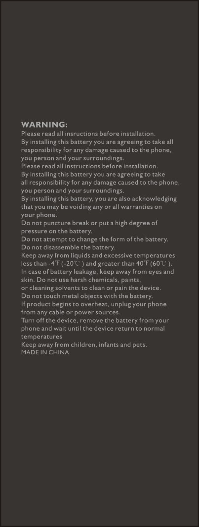 By installing this battery you are agreeing to take all responsibility for any damage caused to the phone,you person and your surroundings.