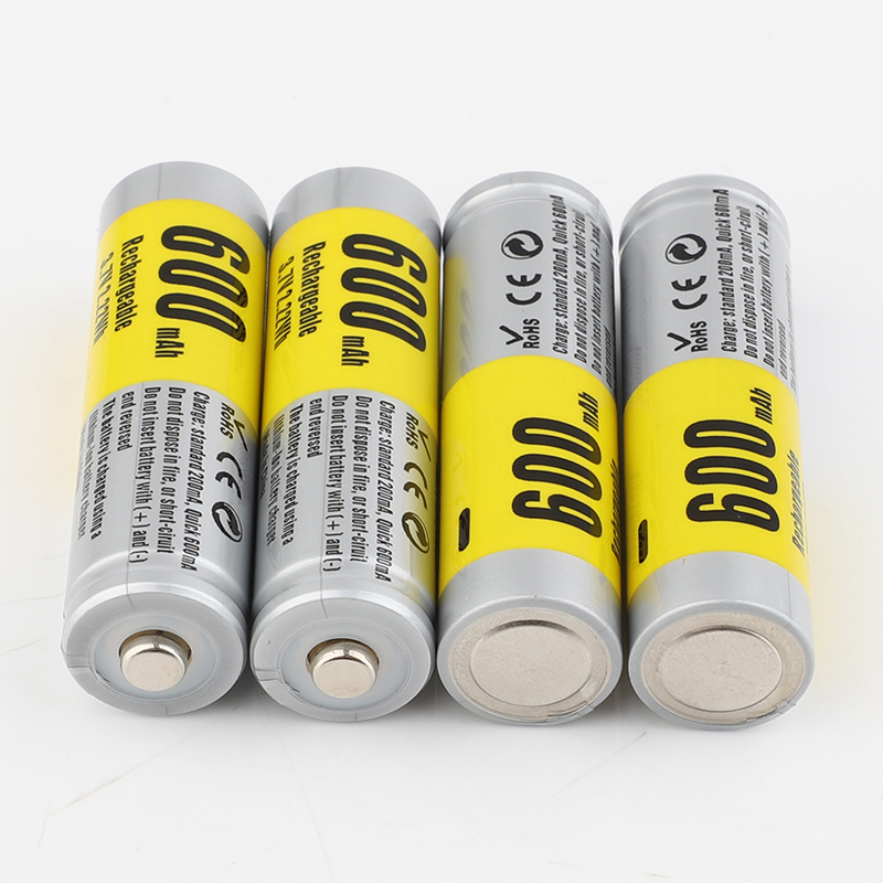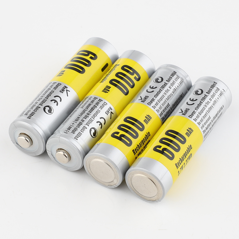 Soshine Cylindrical Lithium ion Rechargeable Battery, IMR14500 3.7V 600mAh Nominal capacity: 600 mA@ 0.2C (100mA) discharge Minimal capacity: 500 mA@ 0.2C (100mA) discharge Nominal voltage: 3.7V Internal resistance: 82-95 mΩ Charge cut-off voltage: 4.2V Charge current Standard charge: 0.2 C5A Rapid charge: 0.5 C5A Standard Charging method: 0.2 C5A constant current (CC) charge to 4.2V, then constant voltage 4.2V (CV) charge till charge current decline to ≤ 0.02 C5A Charging time Standard charge: 7.5 h (reference) Rapid charge: 3.5 h (reference) Max.charge current : 250 mA Max. Continuous discharge current: 250 mA Discharge cut-off voltage: 3.0 V Operating temperature Charge: 0~45 ℃ Discharge: -20~60 ℃ Storage temperature: -10~45 ℃ Storage humidity: ≤85% RH Cell weight: Approx: 17 g