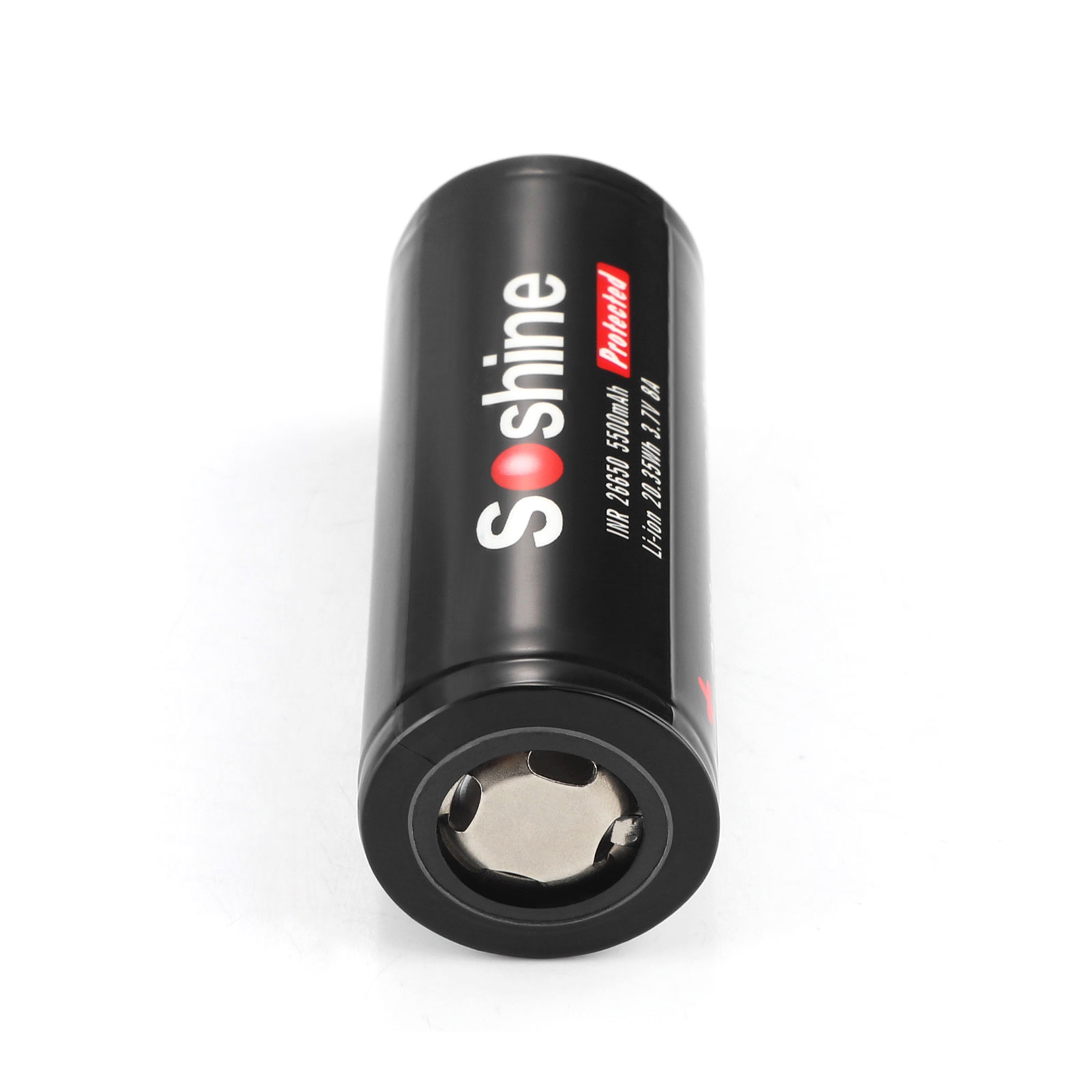 Soshine Li-ion 26650 Battery With Protected: 3.7V 5500mAh -Positive and negative poles Material: Li-ion Internal resistance: 34-40 mΩ Discharge Cut-off Voltage 2.8V/cell Weight: 95g (1 cell), 98 g (1 cell with package), 224 g (2 cell with package) Maximum voltage protection: 4.25V Minimum voltage protection: 2.35V Maximum current protection: 9000 mA Maximum continuous current: 6500 mA |
