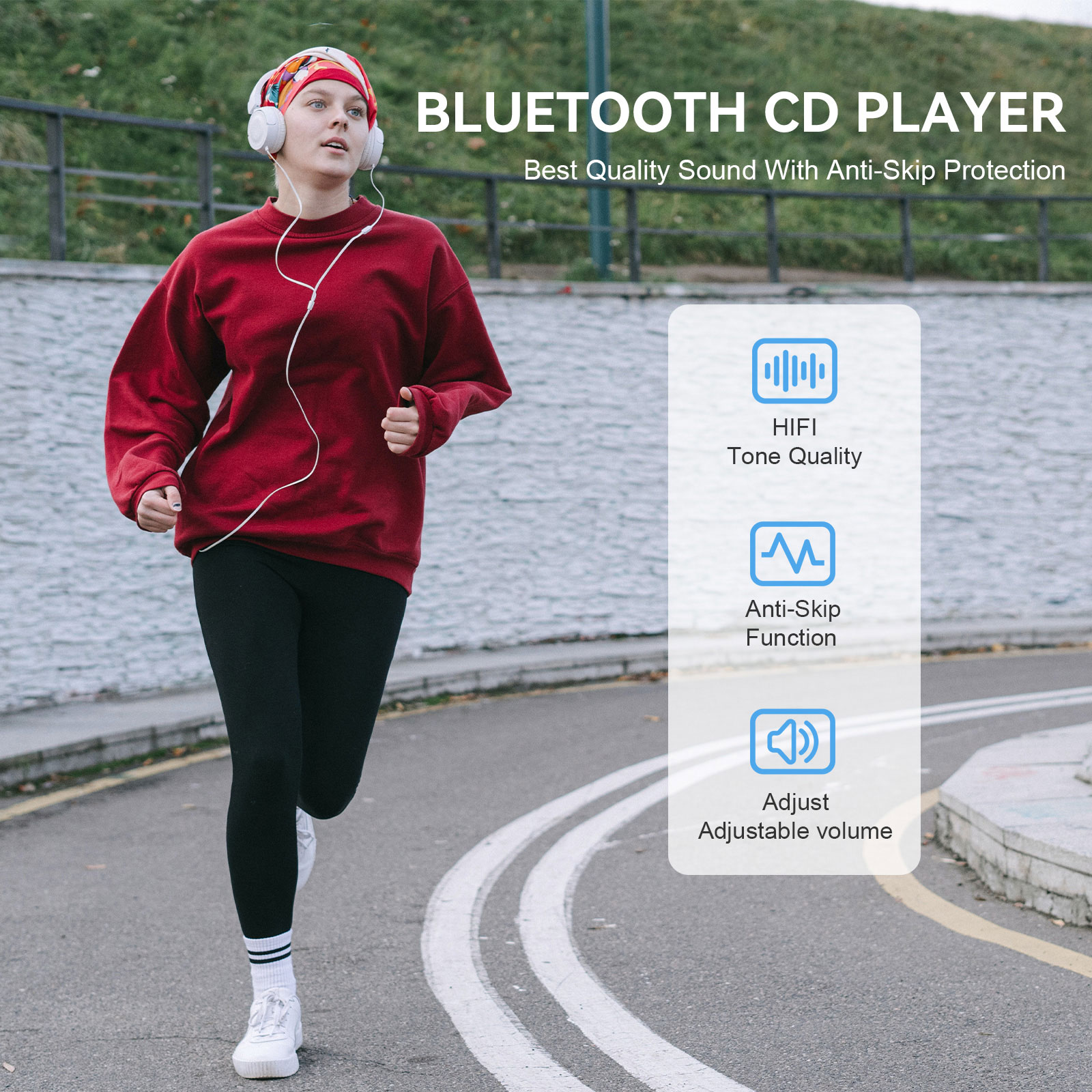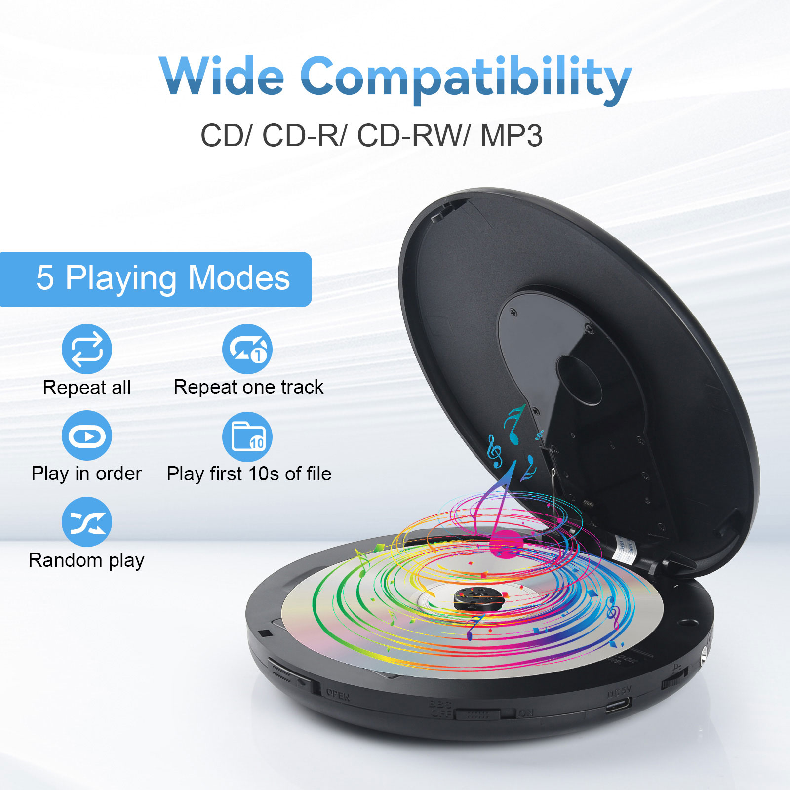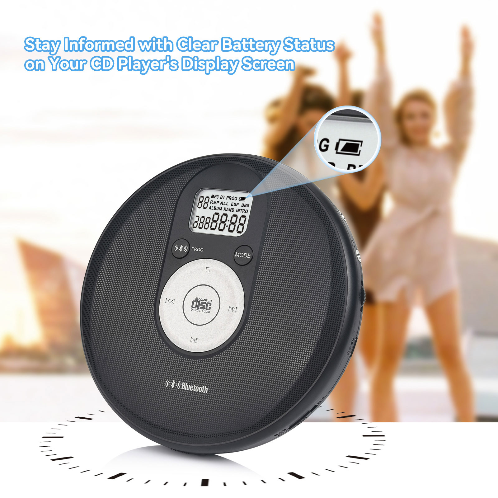NOTES for using the CD player: 1. Battery 1.1 Alkaline AA battery is recommended. When the battery is low, sometimes even though the CD can display, it may shut down during switching or playing. Please replace the battery or connect a 5V 1A DC power supply. 1.2 The AA battery is on the inner base of the CD player. Please take out the battery when it is not used for a long time to prevent the battery from leaking and corroding the hardware. 2. Headphones The headphone jack needs to be a 3-segment 3.5mm TRS headphone jack. If using mobile phone headphones, the jack is a 4-segment 3.5mm TRRS, which is prone to noise. 3. Handle with care Please handle the CD player gently, as it will automatically shut down in case of collision. 4. Bluetooth connection 4.1 The CD player can be connected to devices such as Bluetooth speakers and headphones, and the pairing time is a bit long. 4.2 When connecting Bluetooth headphones or Bluetooth speakers, please disconnect the original Bluetooth connection. 4.3 The Bluetooth indicator light of the headphones or speakers flashes, and the Bluetooth indicator light BT of the CD player also flashes, indicating pairing; After Bluetooth pairing, the Bluetooth indicator light BT on the CD player will no longer flash. Some Bluetooth headphones have buttons in the battery compartment or on the headphones. Please follow the headphone manual to pair them. 5. Audio output LINE is a fixed output and cannot be adjusted. The headphone hole can be adjusted. 6. ESP & HOLD The CD player automatically displays ESP as shockproof. Pushing the HOLD button to ON will invalidate all buttons, and pushing it to OFF will release them. |