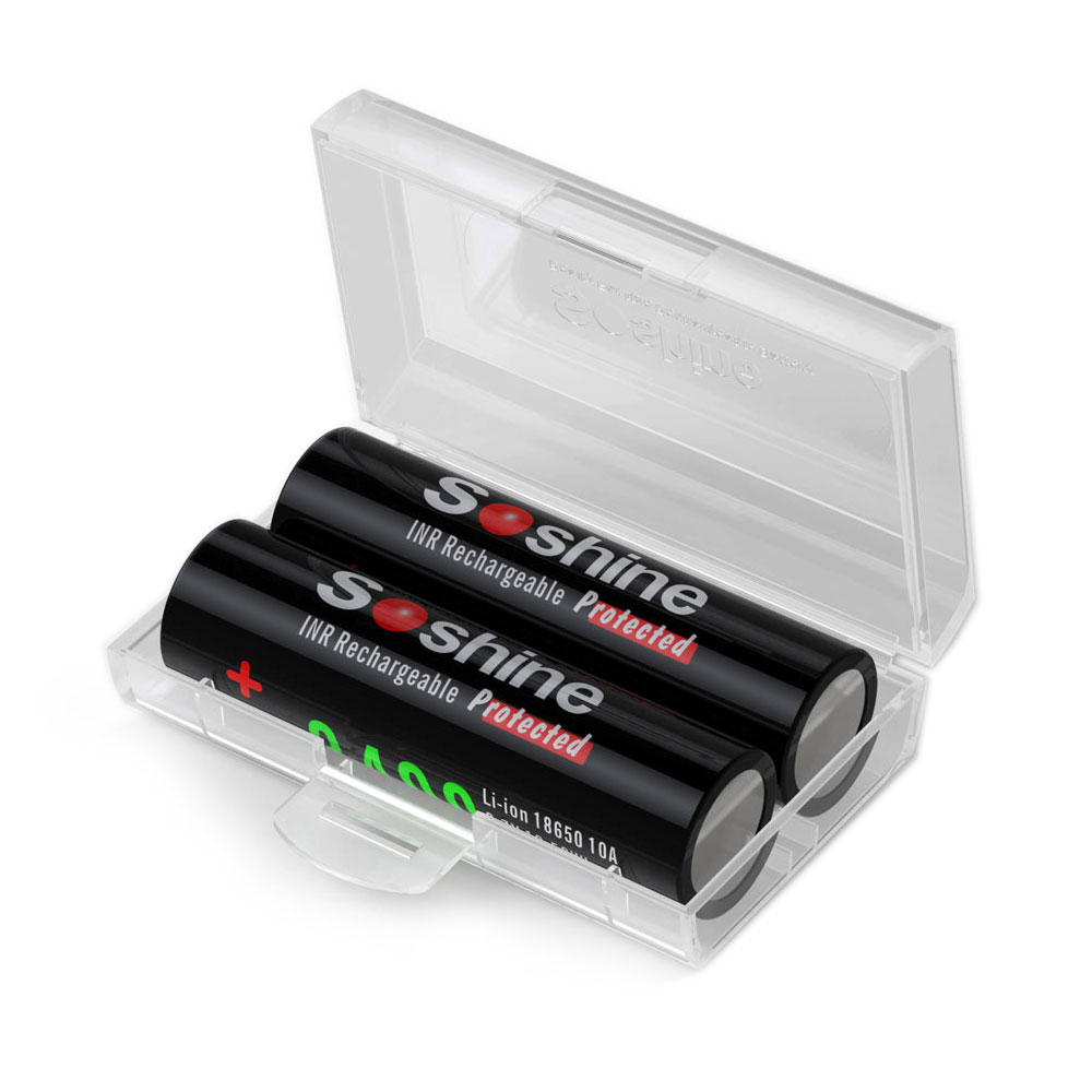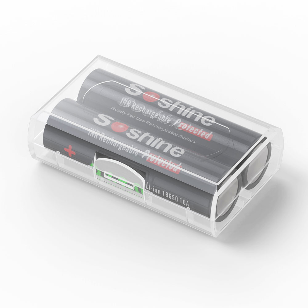 Soshine Battery Storage Case for 2 18650 Batteries or 4 RCR123 Batteries Bar Code:6951151533036 Model:18650x2(SBC-012) - Package included: Battery Storage Case. - Can storage 2pcs 18650 or 4pcs RCR123 batteries. - Battery storage box only,battery not include. - Easy to open or close,convenient to use. - Made of high quality plastic,its very durable. Product details: