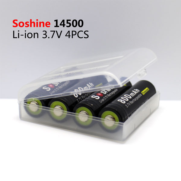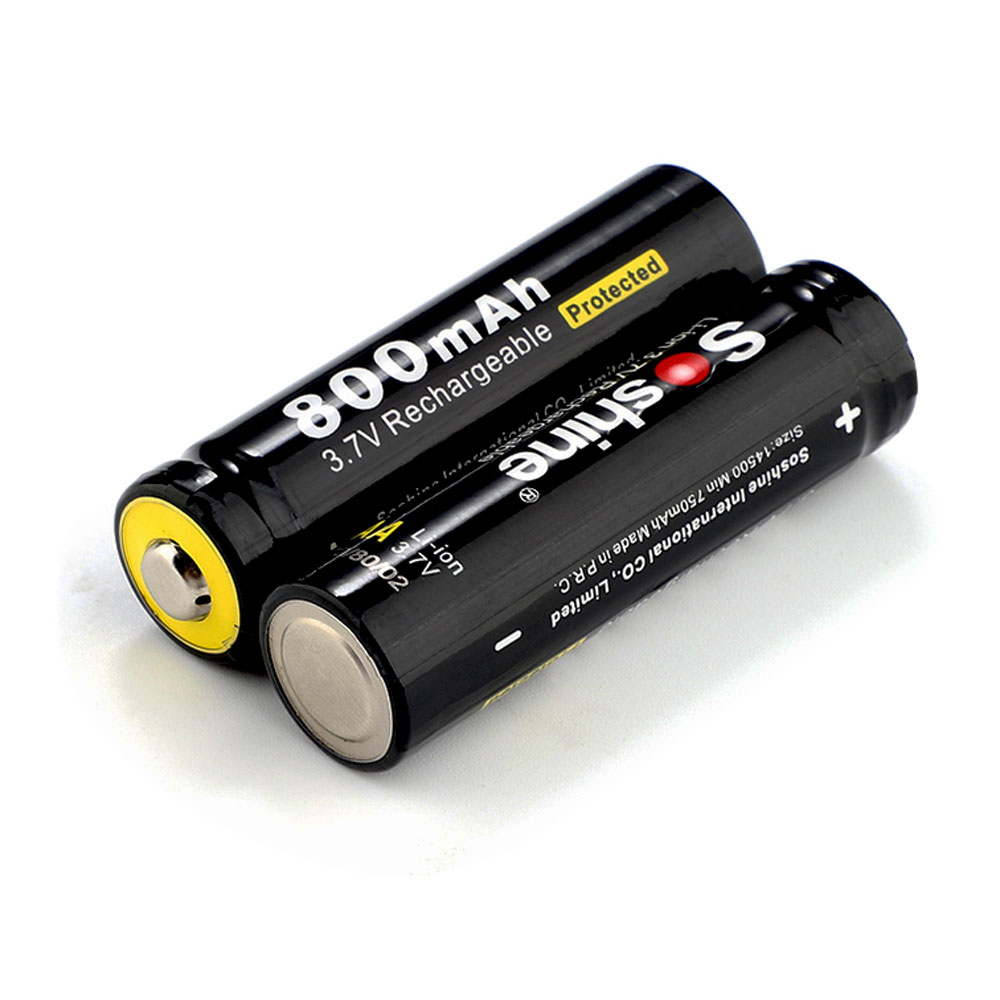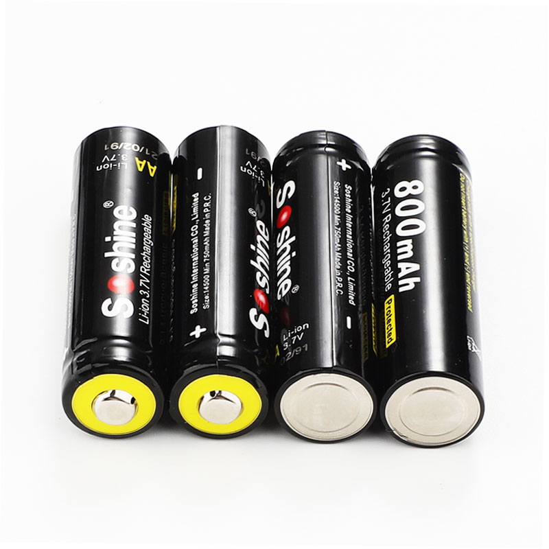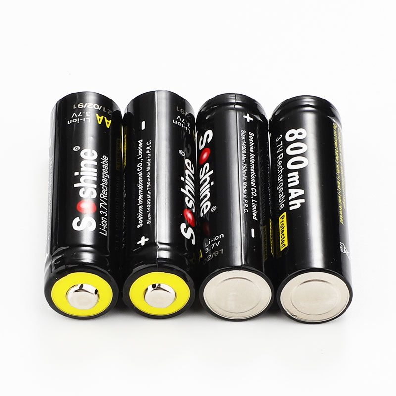 Soshine Battery 3.7v 800mAh 4× Li-ion 14500/AA With Protected Model:14500P-3.7-800 Bar code:6951151512192 Features: AA Li-Ion rechargeable battery 3.7V 14500 size Cylindrical Li-ion Cell, same size as AA 1.2V rechargeable NiMH and NiCd battery. No memory effect and longer storage life than NiMH Batteries. Lighter weight and higher energy density than any other rechargeable batteries. 14500 cell has same size as an AA size battery, but has 3 times higher voltage. It is perfect for building battery pack for RC aircraft, RC cars, and RC robots. Can use special PCB ( protection IC) to build 14500 battery pack. Protected board against short circuit, over discharge, over-current discharge. Specification: 14500/AA Capacity: 800mAh Rechargeable for 1000 times Peak Voltage: 4.2V Nominal/Working Voltage: 3.7V Maximum charge current: 1.5C Maximum discharge current: 2C Internal resistance: 104-110 mΩ Temperature: -40℃~60℃ Dimension: 14x52mm Protected board against short circuit, over discharge, over-current discharge. Maximum voltage protection: 4.25V Minimum voltage protection: 2.35V Maximum current protection: 2000 mA Maximum continuous current: 1500 mA Note: (1) The batteries should be stored at room temperature,charged to about 30% to 50% of capacity. (2) During long term storage,in order to ensure the battery to maintain the capacity level,we suggest Li-ion batteries should be charged and discharged once every 6 months. Test conditions: 1) Temperature: 25~30℃ 2)Equipment: GHC5V50A32Z