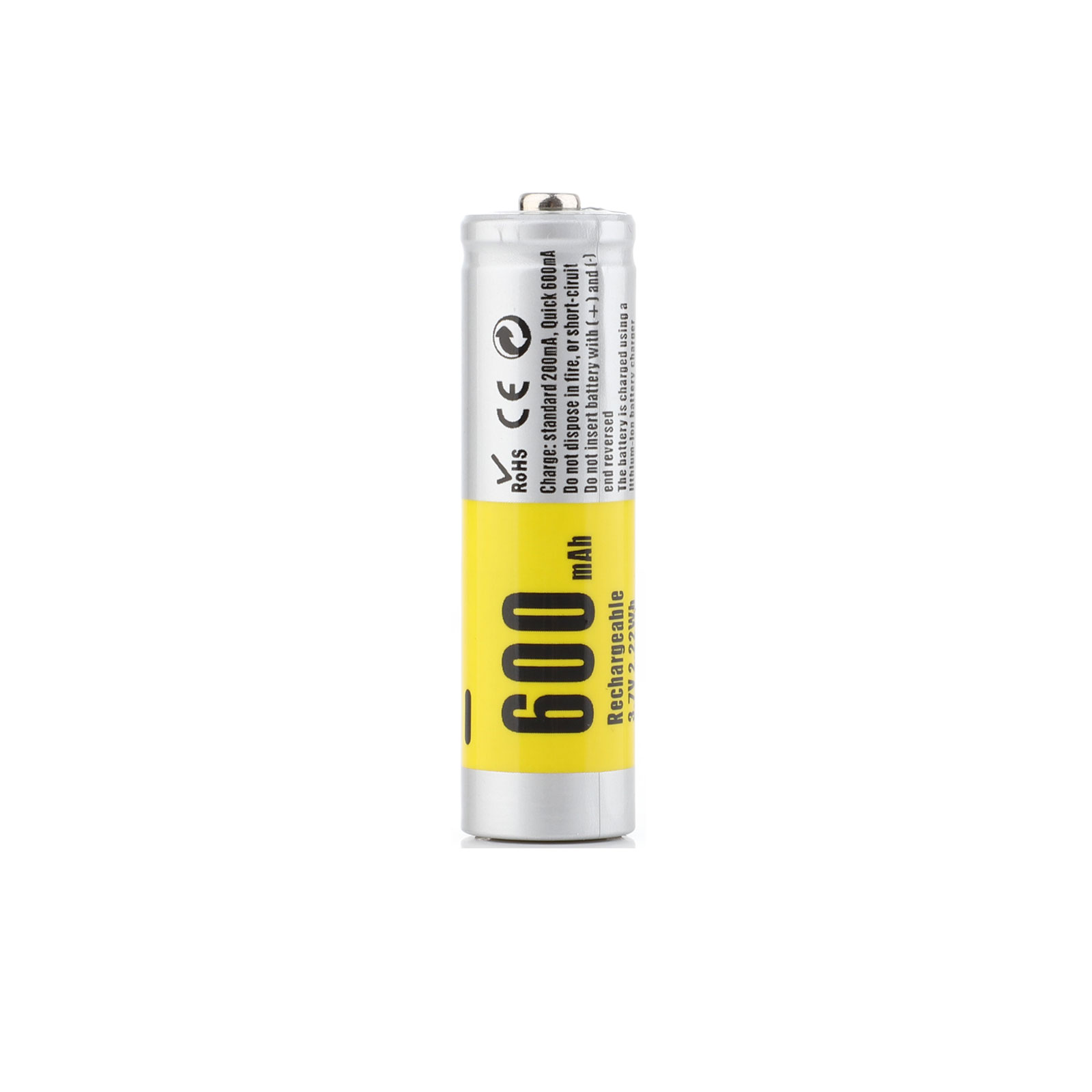 Soshine Cylindrical Lithium ion Rechargeable Battery, IMR14500 3.7V 600mAh Nominal capacity: 600 mA@ 0.2C (100mA) discharge Minimal capacity: 500 mA@ 0.2C (100mA) discharge Nominal voltage: 3.7V Internal resistance: 82-95 mΩ Charge cut-off voltage: 4.2V Charge current Standard charge: 0.2 C5A Rapid charge: 0.5 C5A Standard Charging method: 0.2 C5A constant current (CC) charge to 4.2V, then constant voltage 4.2V (CV) charge till charge current decline to ≤ 0.02 C5A Charging time Standard charge: 7.5 h (reference) Rapid charge: 3.5 h (reference) Max.charge current : 250 mA Max. Continuous discharge current: 250 mA Discharge cut-off voltage: 3.0 V Operating temperature Charge: 0~45 ℃ Discharge: -20~60 ℃ Storage temperature: -10~45 ℃ Storage humidity: ≤85% RH Cell weight: Approx: 17 g