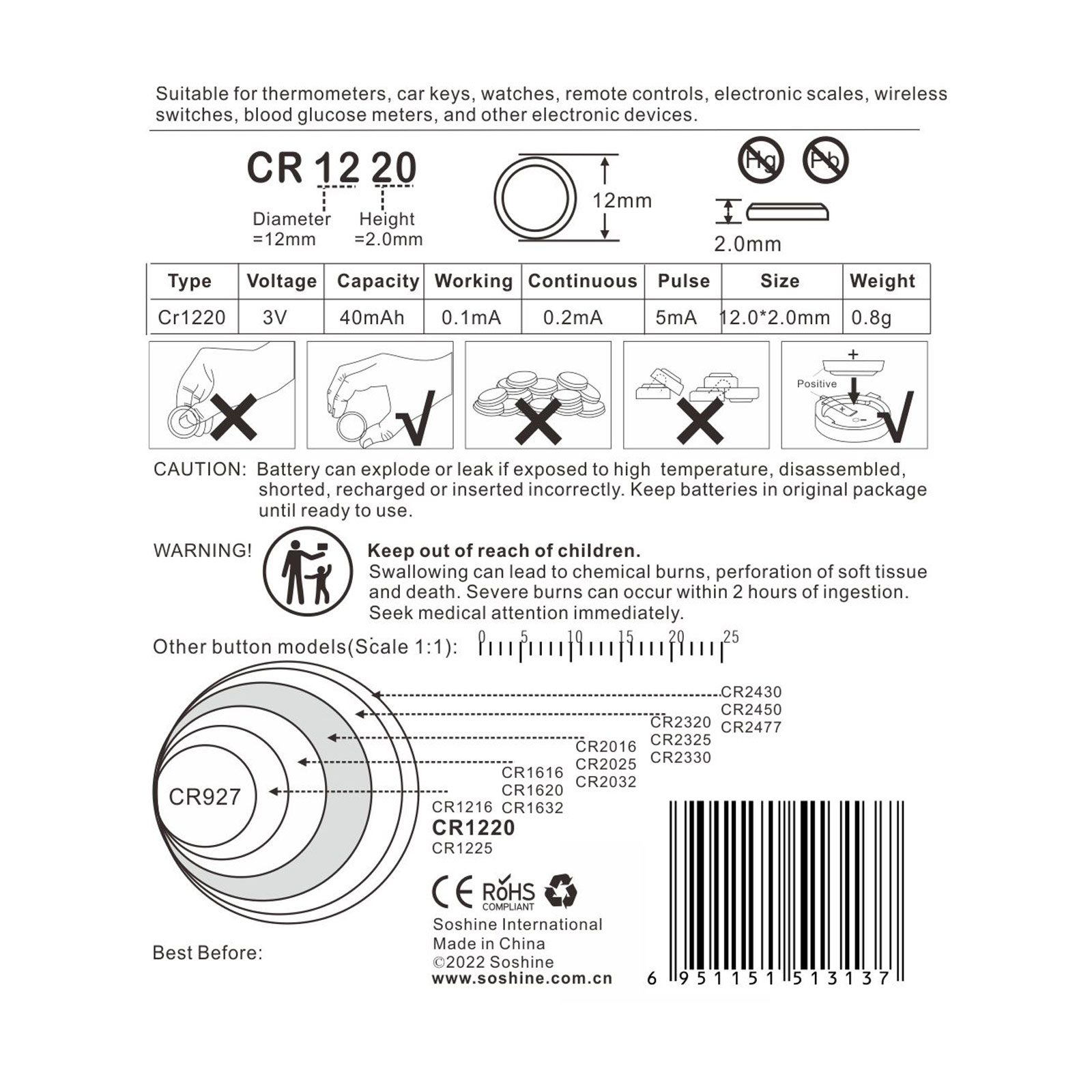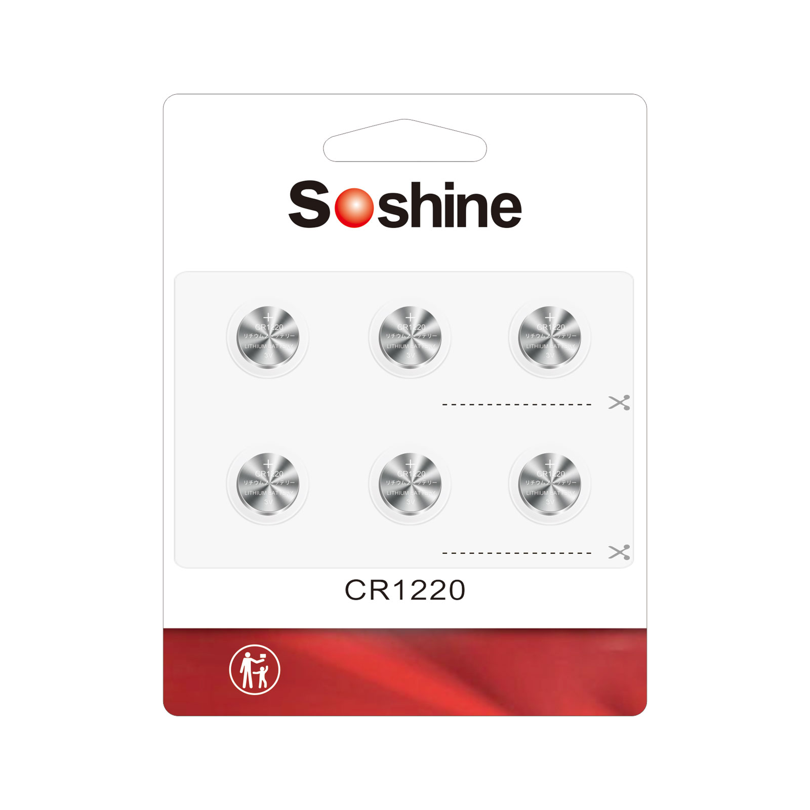Soshine CR1220 Battery Lithium 3v (1 Pack of 6) Cell size: 1220 Application: Weight: 0.8g, 11g(6 pcs with package) Package size(L*W*H):121*100*4mm |