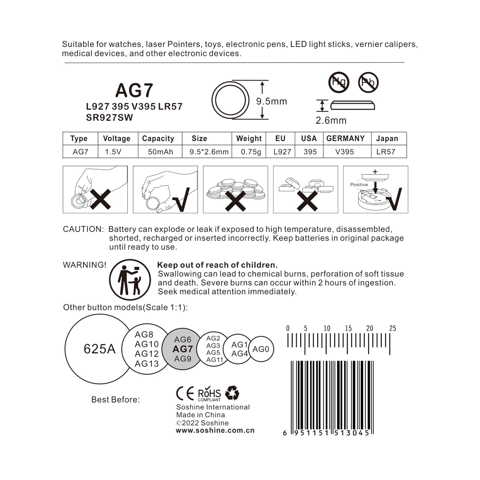 | Soshine AG7 L927 395 V395 LR57 SR927SW Alkaline Button Cell battery (Pack of 12) Cell size:L927 (9.5*2.6mm) IEC: AG7 Volt: 1.5 Capacity: 50mAh Weight: 0.75g, 15g(6 pcs with package) Package size(L*W*H):121*100*4mm Replacement for: 395, SR927SW, AG7, LR927, SR57, SR927, SB-AP/DP, 280-48, LA, V395, D395, 610 and Works Perfect for bullets , eggs , watches , calculators , remote controls , toys and so on. |
