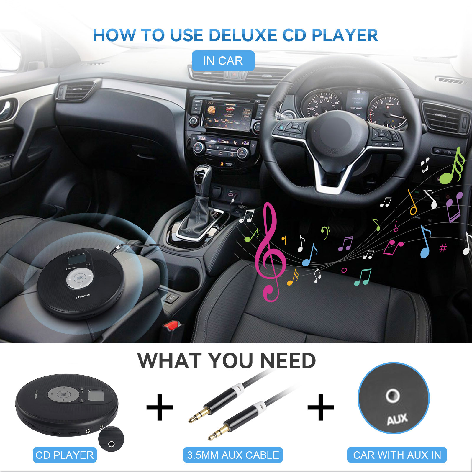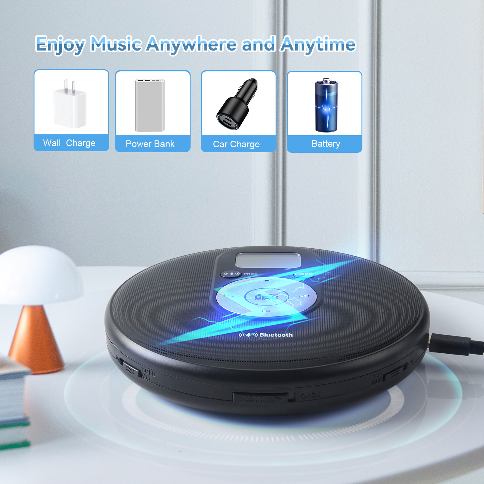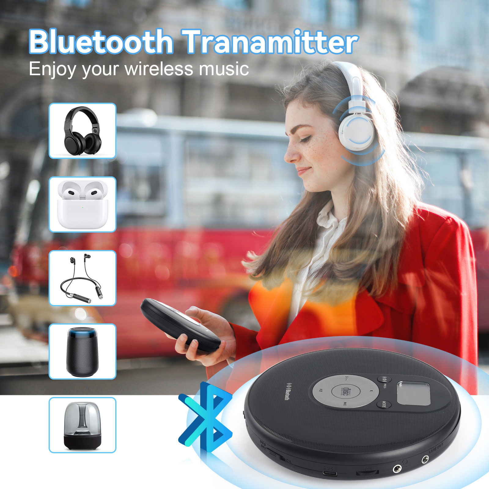NOTES for using the CD player: 1. Battery 1.1 Alkaline AA battery is recommended. When the battery is low, sometimes even though the CD can display, it may shut down during switching or playing. Please replace the battery or connect a 5V 1A DC power supply. 1.2 The AA battery is on the inner base of the CD player. Please take out the battery when it is not used for a long time to prevent the battery from leaking and corroding the hardware. 2. Headphones The headphone jack needs to be a 3-segment 3.5mm TRS headphone jack. If using mobile phone headphones, the jack is a 4-segment 3.5mm TRRS, which is prone to noise. 3. Handle with care Please handle the CD player gently, as it will automatically shut down in case of collision. 4. Bluetooth connection 4.1 The CD player can be connected to devices such as Bluetooth speakers and headphones, and the pairing time is a bit long. 4.2 When connecting Bluetooth headphones or Bluetooth speakers, please disconnect the original Bluetooth connection. 4.3 The Bluetooth indicator light of the headphones or speakers flashes, and the Bluetooth indicator light BT of the CD player also flashes, indicating pairing; After Bluetooth pairing, the Bluetooth indicator light BT on the CD player will no longer flash. Some Bluetooth headphones have buttons in the battery compartment or on the headphones. Please follow the headphone manual to pair them. 5. Audio output LINE is a fixed output and cannot be adjusted. The headphone hole can be adjusted. 6. ESP & HOLD The CD player automatically displays ESP as shockproof. Pushing the HOLD button to ON will invalidate all buttons, and pushing it to OFF will release them. |